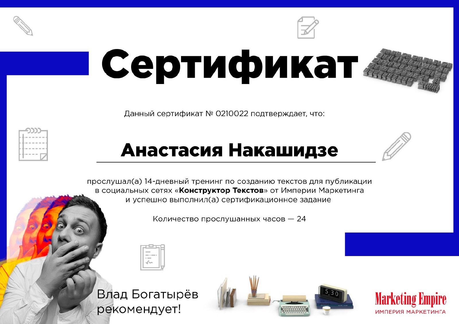 Желаю Анастасии дальнейшего плодотворного развития в её профессии и побольше благодарных и удовлетворенных клиентов!