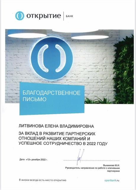 Хотелось бы выразить благодарность Литвиновой Елене за сотрудничество! Она помогла оформить ипотеку, в кратчайшие сроки выйти на сделку и спустя месяц работы- квартира наша! Спасибо вам большое