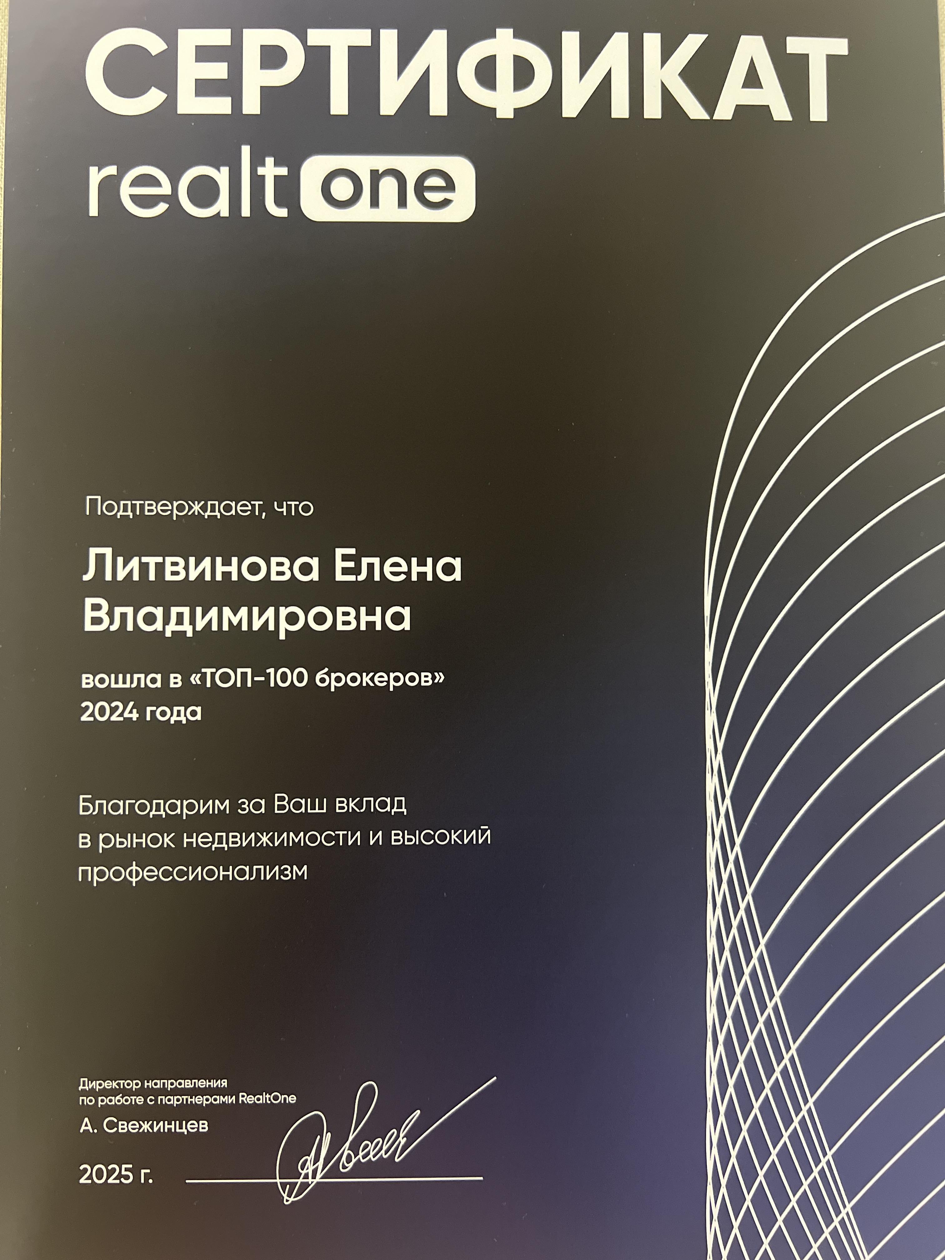 Хочу выразить благодарность Елене Владимировне за профессионализм в работе по реализации моего объекта недвижимости. Проведя грамотную рекламную компанию, подготовив документы и даже оказав покупателю помощь в получении положительного кредитного решения, Елена Владимировна провела сделку в отношении непростого объекта. При этом Елену Владимировну отличает неравнодушное отношение к ситуации, умение найти индивидуальный подход ко всем участникам сделки, способность избежать конфликта и получить желаемый результат, удовлетворяющий как её клиентов, так и другие стороны сделки. ОГРОМНОЕ СПАСИБО, ЗДОРОВЬЯ И УСПЕХОВ В ВАШЕЙ НЕЛЁГКОЙ ДЕЯТЕЛЬНОСТИ.
