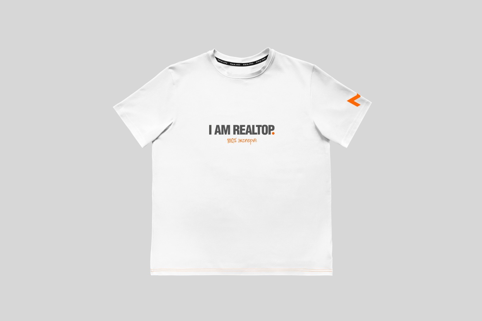 Для тех, кто одет со вкусом. Футболка свободного фасона. Лёгкая белая футболка с надписью "I AM REAL TOP." на груди. Метод нанесения - сублимация. Надпись "100% эксперт" выполнены методом сублимации. Логотип на рукаве нанесен методом машинной вышивки.
