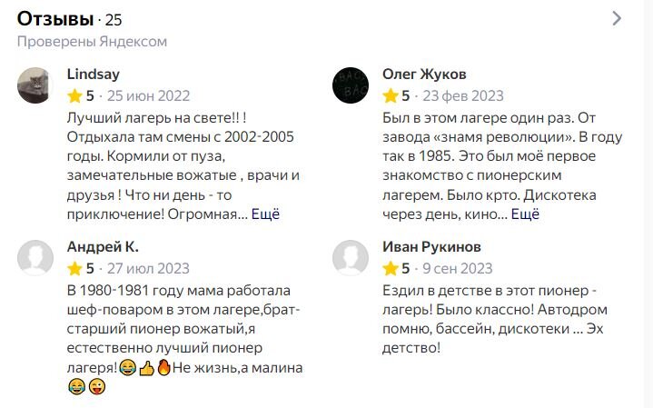 «Лучший лагерь на свете! Отдыхала там смены с 2002-2005 годы. Кормили «от пуза», замечательные вожатые, врачи и друзья! Что ни день, то приключение! Огромная территория! Свой автодром, мини-зоопарк, бассейн, кружки, дискотеки и кино, салюты и перечислять можно бесконечно! Как жаль, что детей сейчас лишают детства и не дают насладиться юностью и жизнью! Лагерь закрыт с 2013 года. Сейчас мне 30, и я до сих пор поддерживаю связь с ребятами из лагеря! Надеюсь, лагерь вернет свою былую красоту и славу!».
