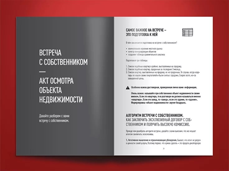 Ежедневник «Делай и богатей» - это рабочий инструмент. В нем есть три блока. Первый - блок теории. Здесь выжимка всего самого необходимого, что поможет зарабатывать: алгоритмы встреч, скрипты разговоров, отработки возражений собственников. Все то, что бывает нужно в неожиданный момент. Здесь сжаты три года опыта, ошибок, недополученной комиссии и выводов. Бери и делай.