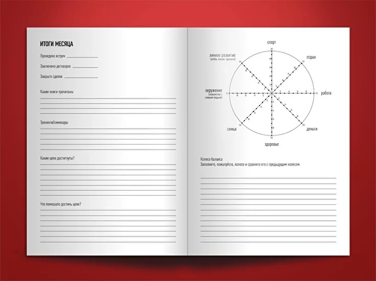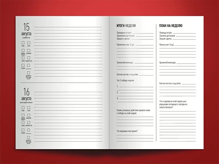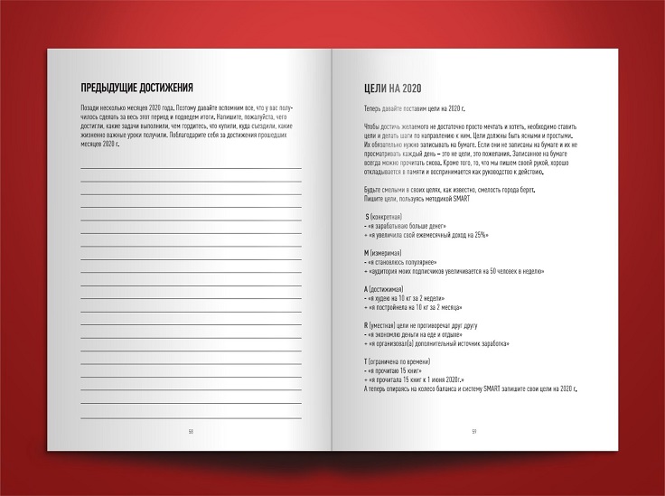 В такой системной работе крайне важна самоаналитика: быть честным с самим собой и осознавать что ты делаешь и зачем. Ежедневник сделан так, что не позволит вам смухлевать или сбежать от дел. Любое уклонение покажет, что вы остановились и не движетесь к своей цели.